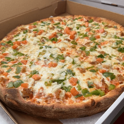 Chicken, fresh tomatoes, onions, green peppers, mozzarella cheese, and sauce.
